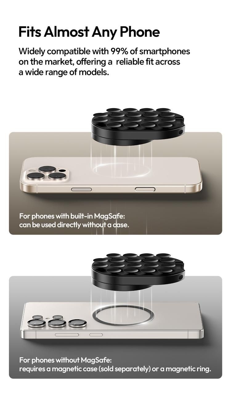 Compatibility | iPhone 12-17 (MagSafe), MagSafe cases, all phones (with included metal ring) |
